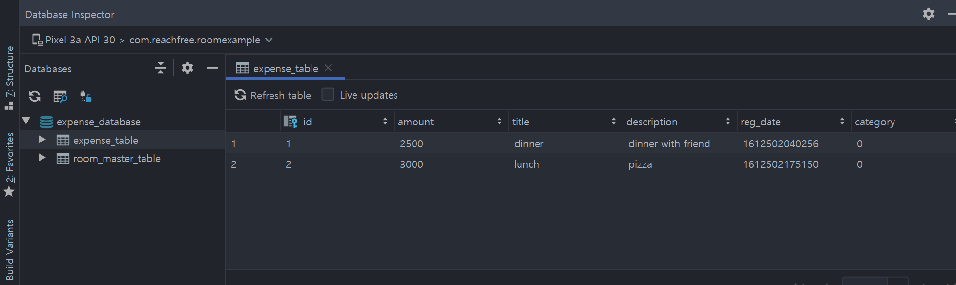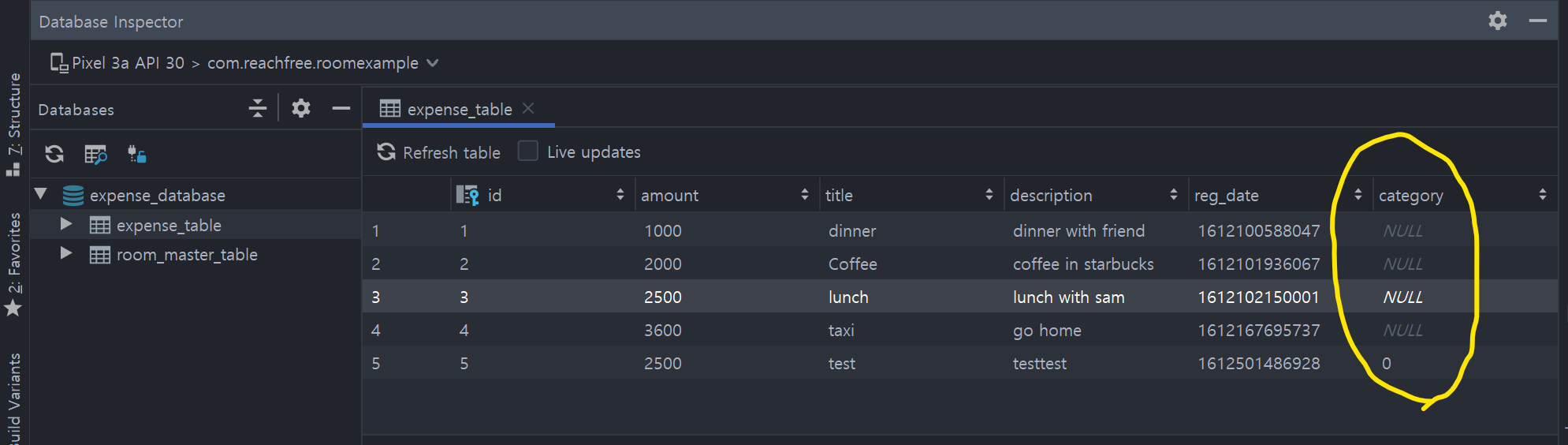 Database Inspector화면에서 category 컬럼이 생기고 default값인 0이 추가되었습니다.