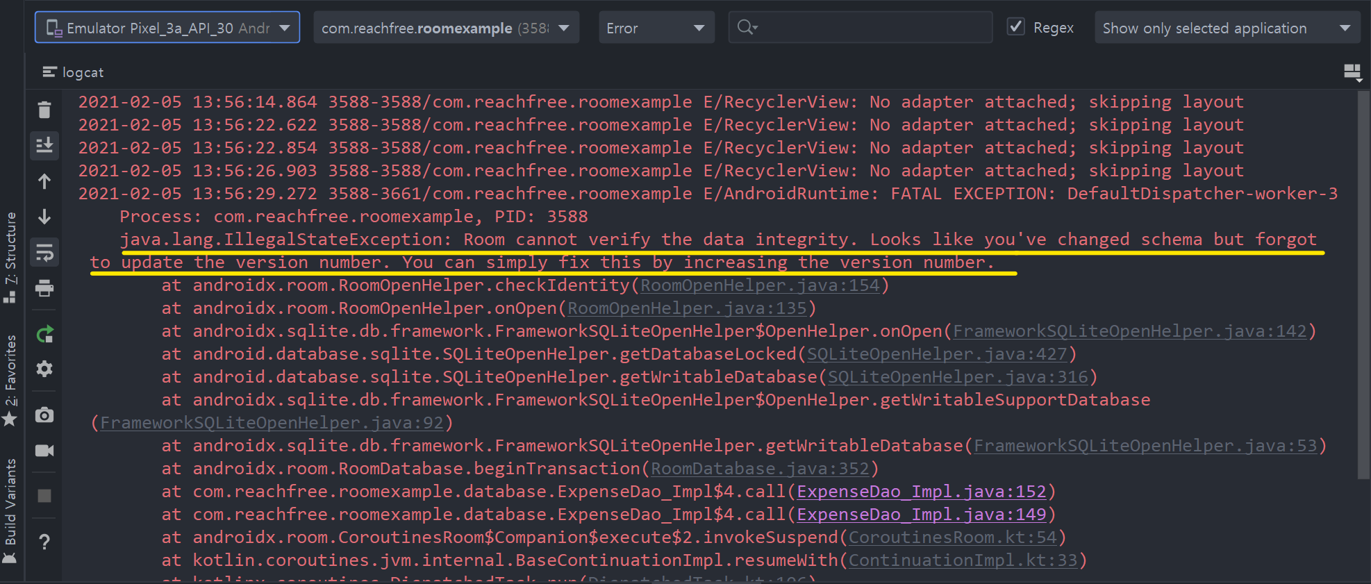 Room cannot verify the data integrity. Looks like you've changed schema but forgot to update the version number. You can simply fix this by increasing the version number.