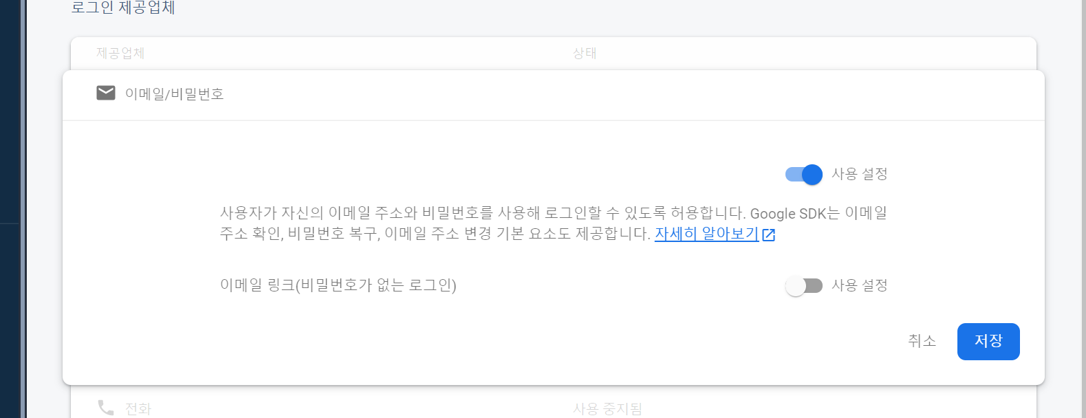 다시 돌아오면 아래와 같이 이메일/비밀번호 상태가 사용설정됨으로 변경되었습니다.