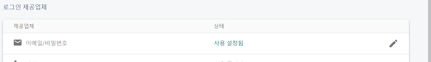 이메일/비밀번호를 사용할 예정으로 이를 활성화 해줘야 합니다. 이를 위해 우측에 수정 아이콘을 클릭합니다.