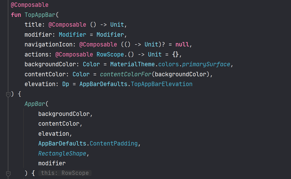 TopAppBar 컴포넌트는 아래와 같이 다양한 매개변수를 받습니다.